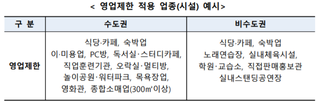 - 수도권 집합금지(지속): 유흥업소 5종, 홀덤펍, 노래방, 실내체육관, 실내공연장, 판매홍보관
