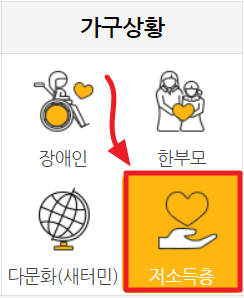 3. 페이지 이동 후 가구 상황 카테고리에 있는 '저소득층'을 선택해 주세요