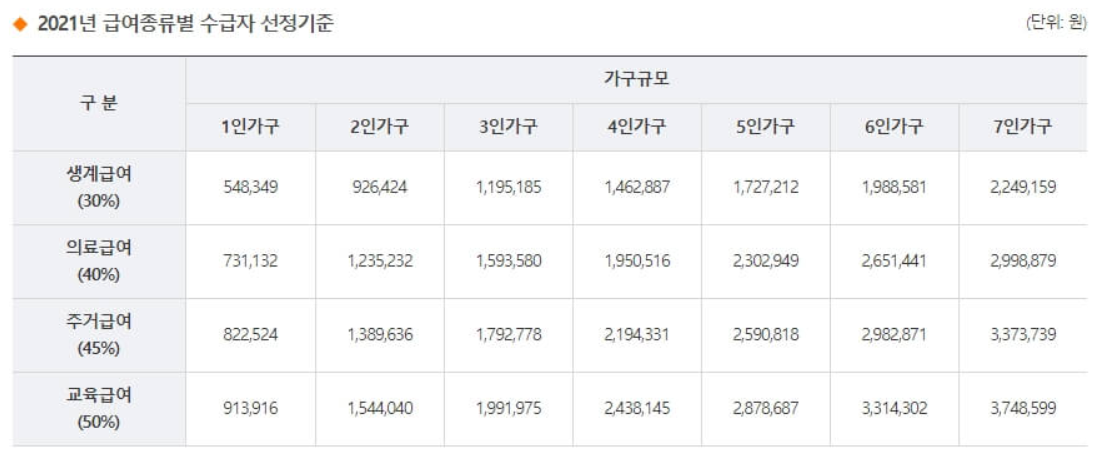 위에서 기준중위소득에 대해서 알아봤는데요. 기초생활수급자격요건을 만족하기 위해선 기준중위소득 요건과 부양가족 자격요건을 만족하셔야 합니다.