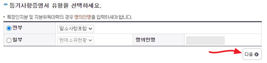 6. 등기사항 증명서 유형 선택 후 '다음'을 눌러주세요