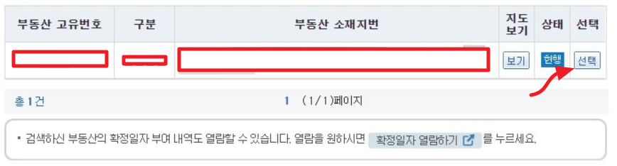 5. 검색 후 해당 부동산 고유번호 및 관련 정보를 확인 후 '선택'을 눌러주세요