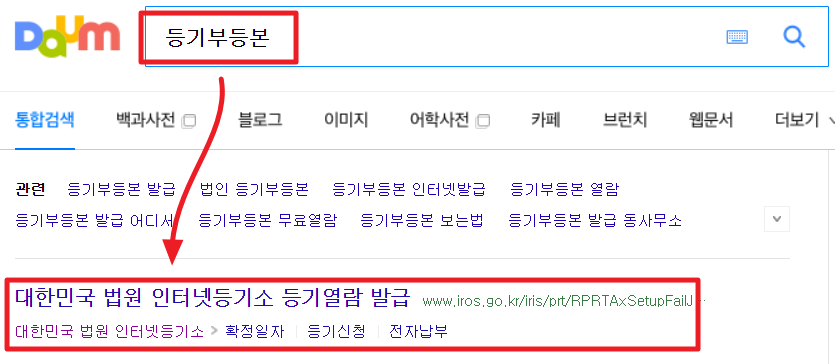 1. 검색포털 검색창에 '등기부등본' 을 검색한 후 대한민국 법원 인터넷등기소 홈페이지로 이동해주세요
