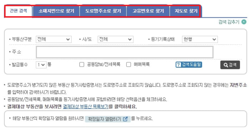 4. 원하시는 검색 방법을 통해 해당 등기부등본 주소정보 입력 후 검색해 주세요