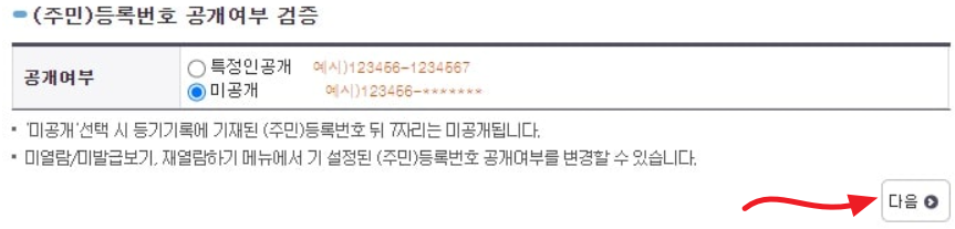 7. 주민등록번호 공개여부 선택 후 '다음'을 눌러주세요