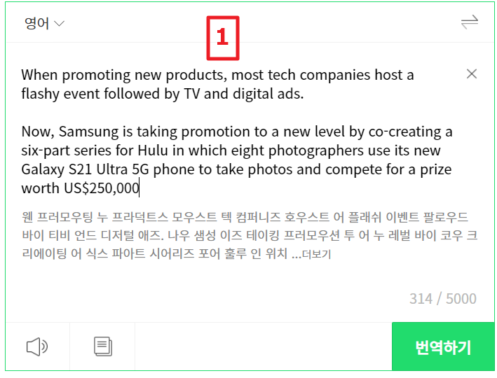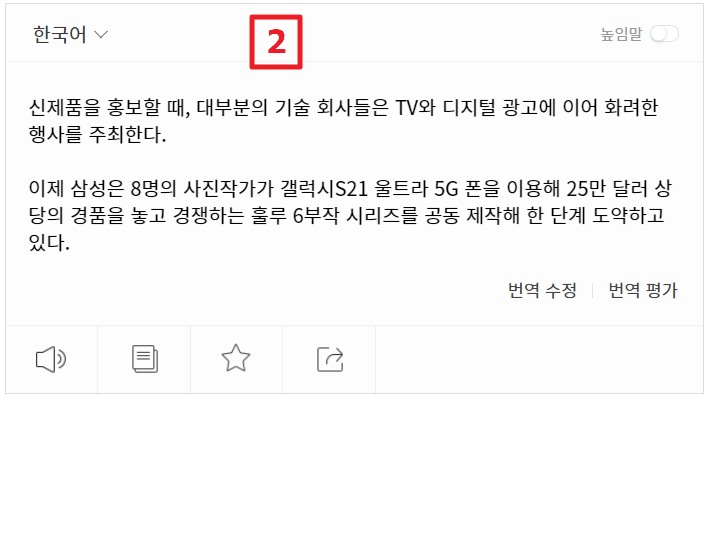 파파고 홈페이지 접속 후 원하는 기사나 자료를 복사한 후 1번과 같이 붙여 넣기를 하면 오른쪽 2번 사진과 같이 파파고가 번역을 깔끔하게 해 준답니다. 1번 사진 아래에 보면 한글로 영어 발음을 표기해뒀는데요.. 사실 이 기능은 정확한 발음이 잡히면 도움이 되지만 발음이 잡히지 않은 상태에서 한글로 영어발음을 익힌다면 나중에 돌이킬 수 없으니.. 웬만하면 이용하지 마시길 바랍니다.