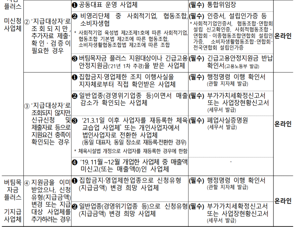 소상공인 버팀목자금 플러스 확인지급 대상에 포함되는 분들 중에 공동대표 운영 사업체나 협동조합이나 소비자 생협, 그리고 긴급고용안정지원금을 받은 사업체들 역시 추가 서류 제출해 확인과 검증을 받아야 하는데요. 필요한 서류에 대한 정보는 아래를 통해 확인해 보시기 바랍니다.