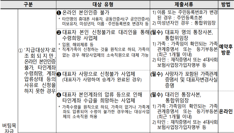 - 버팀목자금플러스.kr 에서 지급대상자로 조회되지만 온라인 본인인증 불가나 계좌압류, 혹은 타인의 계좌로 수령 등의 사유로 신청이 불가한 경우