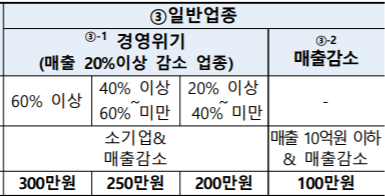 소상공인 버팀목자금 플러스는 지난 3차 재난지원금 버팀목자금보다 더 세분화되어 일반업종 경영위기 10개 업종에 대한 추가지원을 실시하고 있습니다. 소상공인 매출감소 정도에 따라 추가지원금액이 세분화 되었습니다.