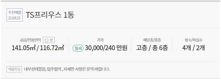 부동산114를 통해 매물을 검색해 보겠습니다. 우선 지도에 있는 아파트 매물을 랜덤으로 선택해보면 위와 같이 나옵니다.