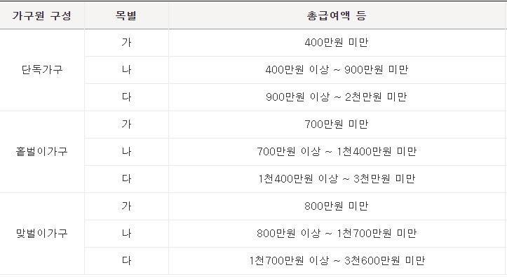 - 홑벌이 가구의 경우, 연 총소득액이 3,000만원 미만이어야 하며,