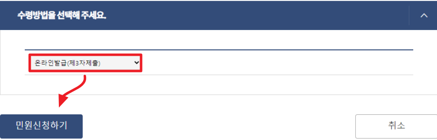 7. 수령방법을 선택한 후 민원 신청하기를 눌러주세요.