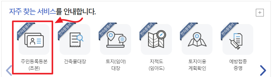 2. 정부24 홈페이지 이동 후 첫 페이지에 보이는 '주민등록등본(초본)'을 선택해 주세요