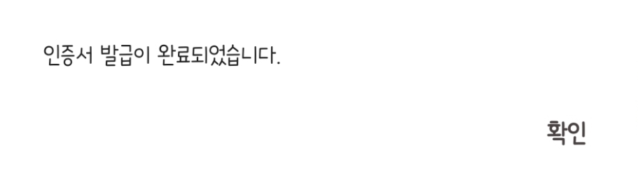 6. 위 과정을 마치면 사진과 같이 인증서 발급 완료 창이 뜨면 확인을 눌러주세요