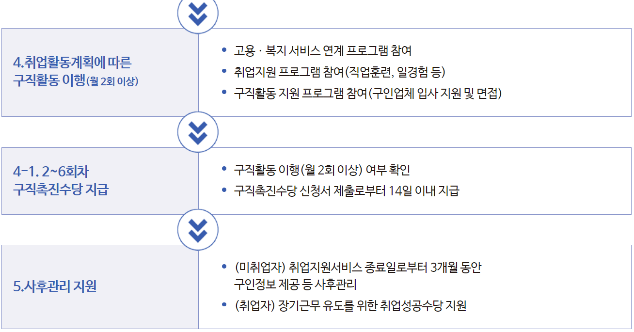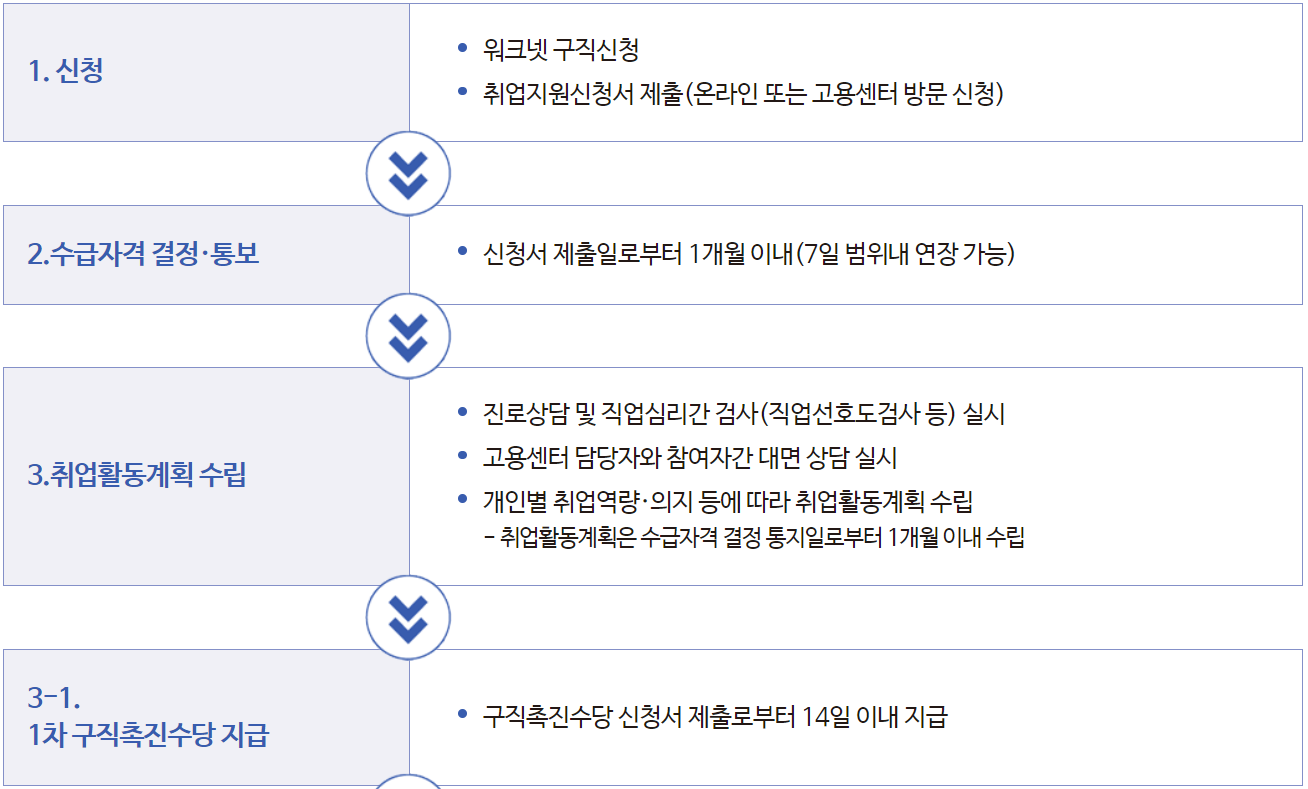우선 워크넷 홈페이지나 고용센터에 취업지원 신청서를 제출하고 상담을 마친 후 구직촉진수당을 받을 수 있습니다. 그리고 관련 직업훈련과 함께 구직활동을 하시는 동안 구직촉진수당을 계속 받게 되며 취업을 성공하게 되면 취업성공수당까지 받게 되는 과정입니다.