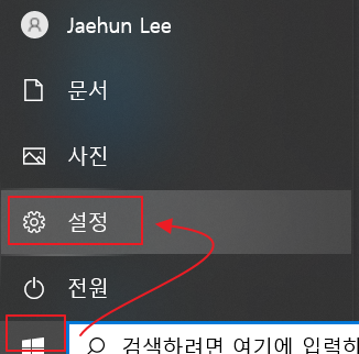 1. 바탕화면 왼쪽 하단 윈도우 버튼 선택 후 설정을 눌러주세요