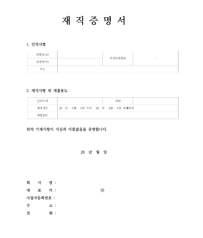 일반적으로 재직증명서는 인적사항, 재직 사항, 발급일자 및 용도, 그리고 발급일자 등을 표기하는데요. 각 단체나 직장에서 정해진 규정으로 서식이 정해 지므로 각 단체나 직장에서 요구하는 서식이 다를 수 있습니다. 만약 특정 재직증명서 양식을 요구하는 곳이 있다면 그에 맞는 것을 사용하는 것을 추천드립니다.