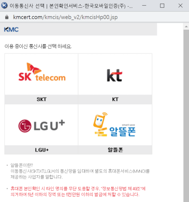 4. 팝업창이 뜨면 통신사를 선택해 주세요