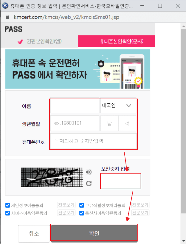 5. PASS 창으로 이동 후 개인정보 및 보안숫자 입력 후 확인을 눌러주세요