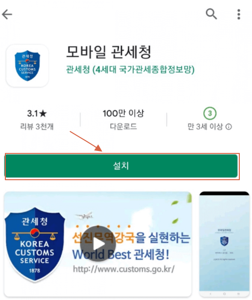 1. 플레이 스토어에 '모바일 관세청' 검색 후 설치해 주세요