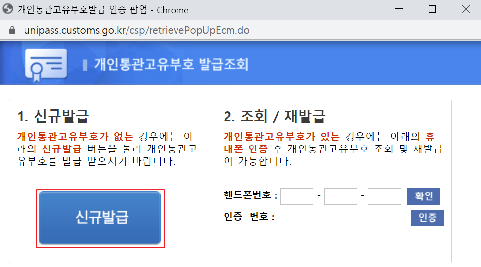 3. 팝업창이 뜨면 신규발급을 눌러주세요 (기존에 발급 받았다면 조회를 통해 재발급 받으세요)