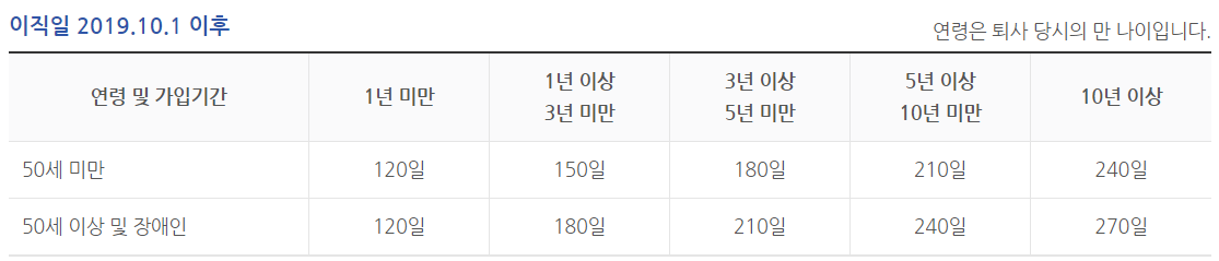 만약 이직한 날이 2019년 10월 1일 이후라면 구직급여 소정급여일수는 50세 미만 최대 240일까지 적용가능하며 50세 이상 및 장애인의 경우 최대 270일까지 적용이 가능합니다.