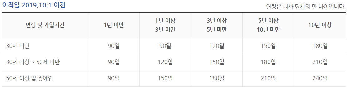 이직 날짜가 만약 2019년 10월 1일 이전이라면 30세 미만의 경우 최대 180일, 50세 미만은 210일, 그리고 50세 이상 및 장애인의 경우 최대 240일까지 구직급여 소정급여일수 적용이 가능합니다.