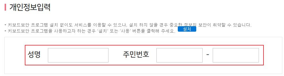 5. 본인 성명과 주민번호 입력 후 원하는 본인 인증 방법을 통해 본인인증을 해주세요