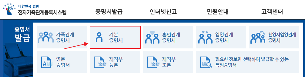 ▼전자 가족관계 등록시스템 홈페이지 이동 후 메인화면에 있는 기본증명서를 눌러주세요