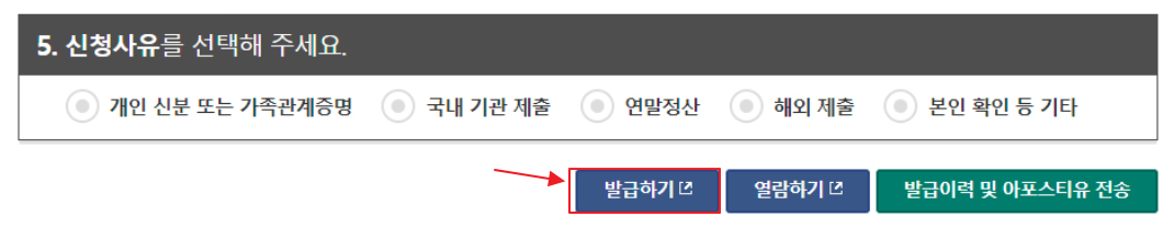▼신청사유를 선택 후 발급하기를 눌러주세요