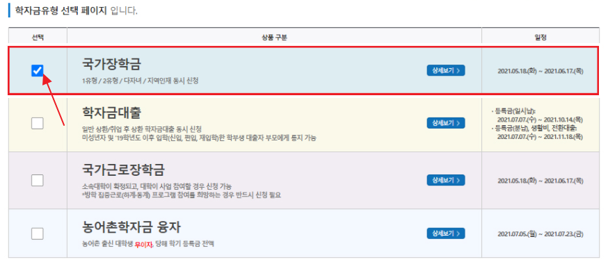 ▼학자금 유형 중 국가장학금에 체크를 한 후 확인을 눌러주세요